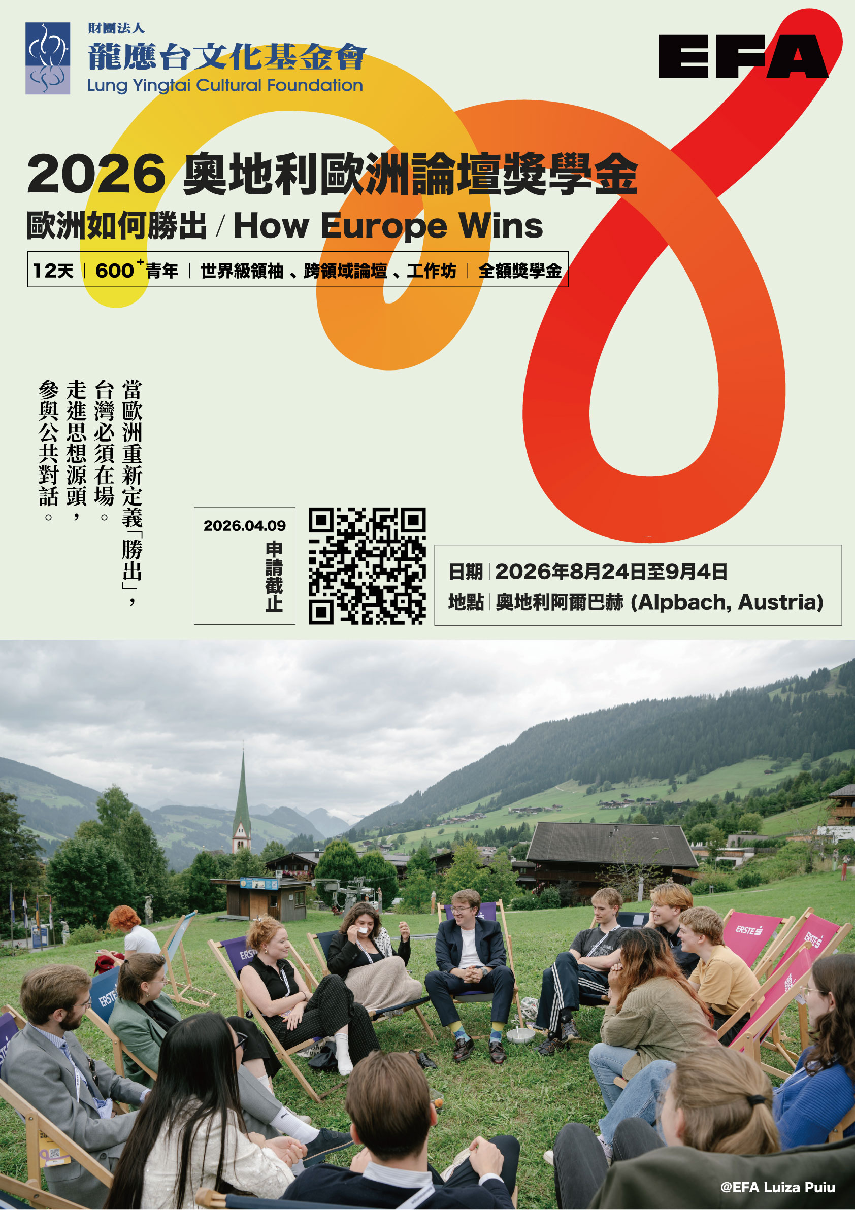 在全球競逐、風險擴大的時代,「勝出」已不再只是效率、規模或競爭優勢的問題,而是一個關於價值選擇、制度設計與公共責任的核心提問。2026 年夏天,歐洲論壇(European Forum Alpbach)以How Europe Wins 為主題,邀請來自世界各地的青年、思想者與決策者齊聚奧地利阿爾巴赫(Alpbach),重新思考歐洲如何在地緣政治、科技變革、民主治理與永續發展的交會點上,回應關鍵挑戰。