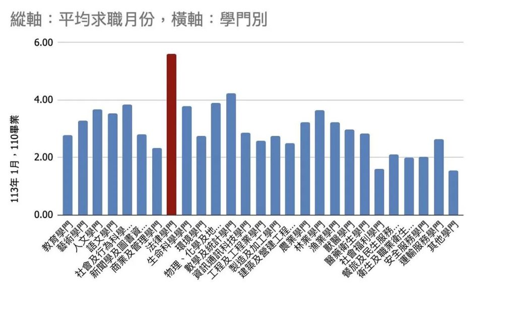 以 110 年畢業生為例,直至 113 年的 1 月份,平均需要花到 5.6 個月的時間才能順利就業。而攤開歷年數據,法律學門在這個統計中,常常都是「一枝獨秀」的存在。